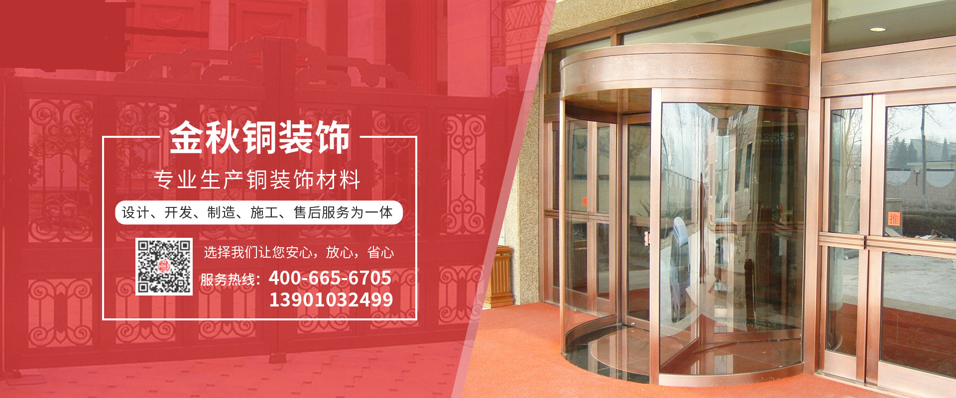 北京金秋銅裝飾材料有限公司是專業生產銅裝飾材料及設計、開發、制造、施工、售后服務為一體的大型綜合企業。可承接建筑銅裝飾工程及五星級酒店、別墅、博物館、樓樘管所等高檔銅裝飾項目;生產各種規格的旋轉門、平滑門、別墅門、電控門、工藝門、旋轉護欄、屋頂銅飾防水瓦、浮雕壁畫......